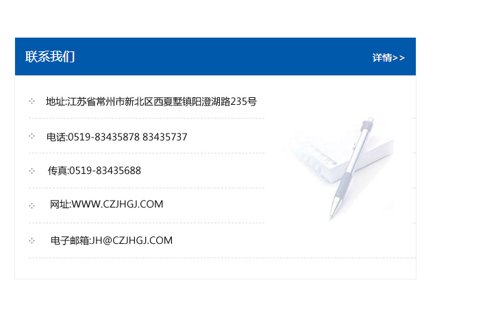 地址:常州市新北區友邦商務大廈1幢16、17層  電話:0519-85101652  傳真:0519-85112595  郵編:213022  網址:www.cz-jiayue_cn.tzseba.com  郵箱:xiajifengaa@163.com